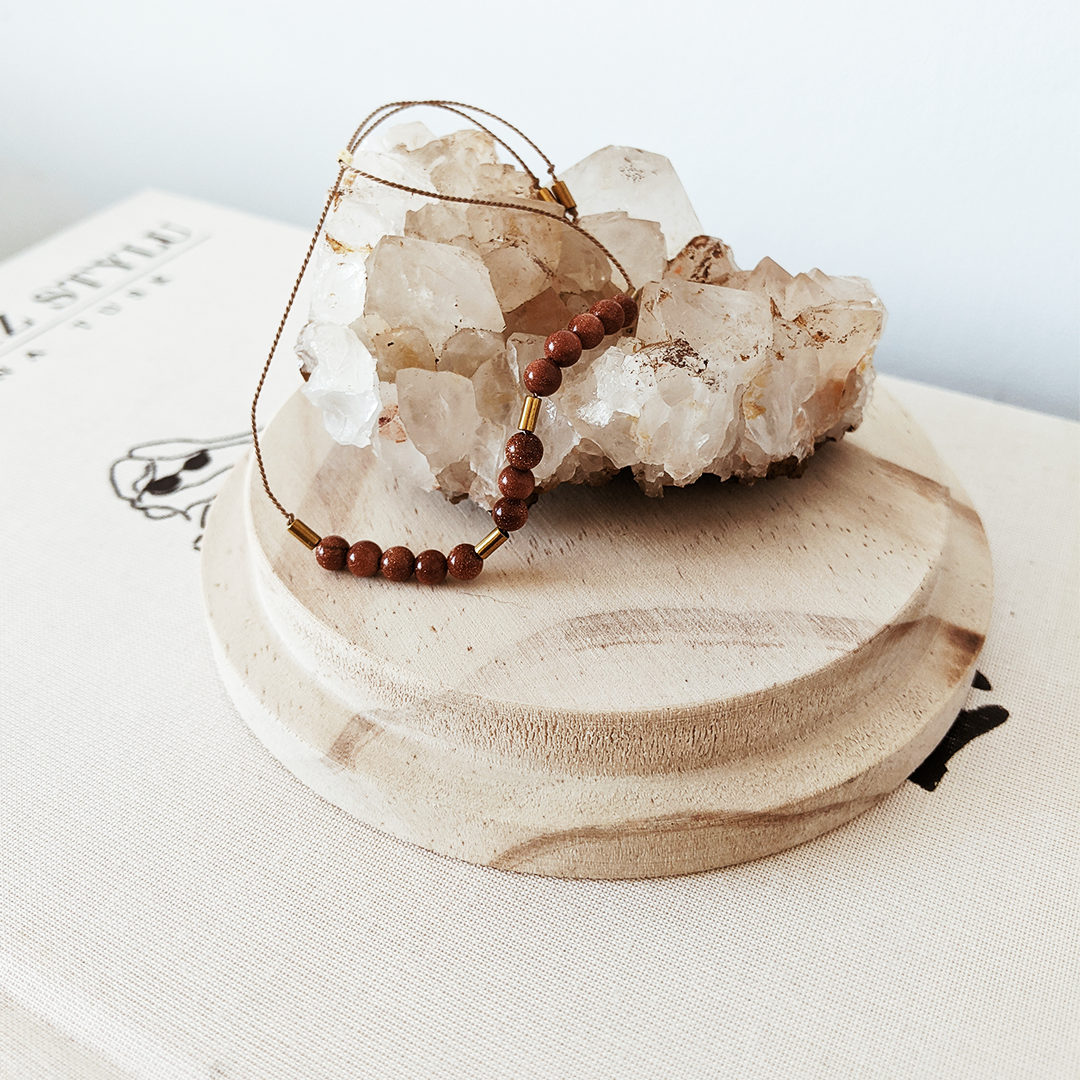 Bransoletka wykonana jest z piasku pustyni oraz hematytu. Doskonała na lato. Pięknie będzie prezentować się na muśniętej słońcem dłoni…  Dodaje również pewności siebie.